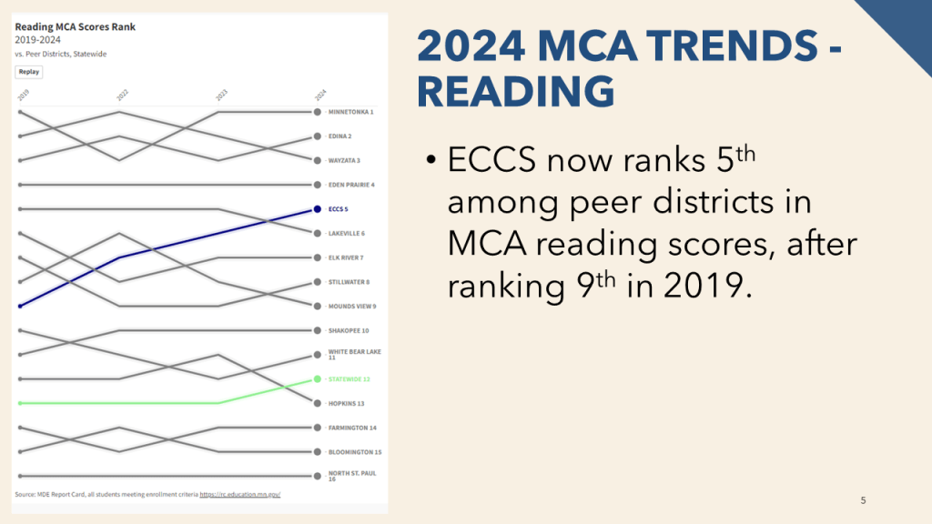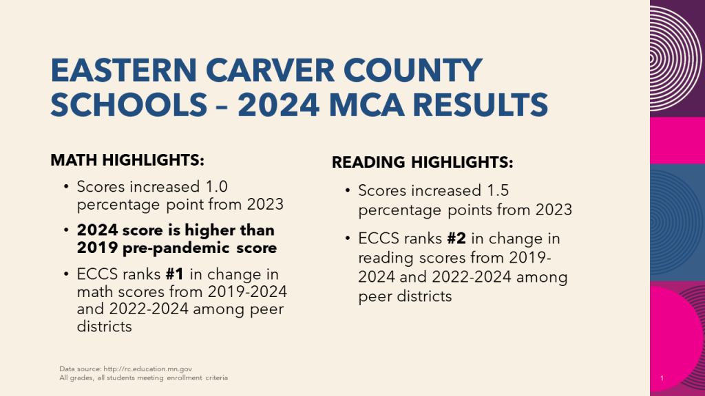 The 2024 MCA results were released last week. I’m pleased to report that despite the headlines you see about stable results at the state level, Eastern Carver County Schools continues to display real academic progress in our math (up 1 percentage point) and reading (up 1.5 percentage points) scores. Here are a few highlights: