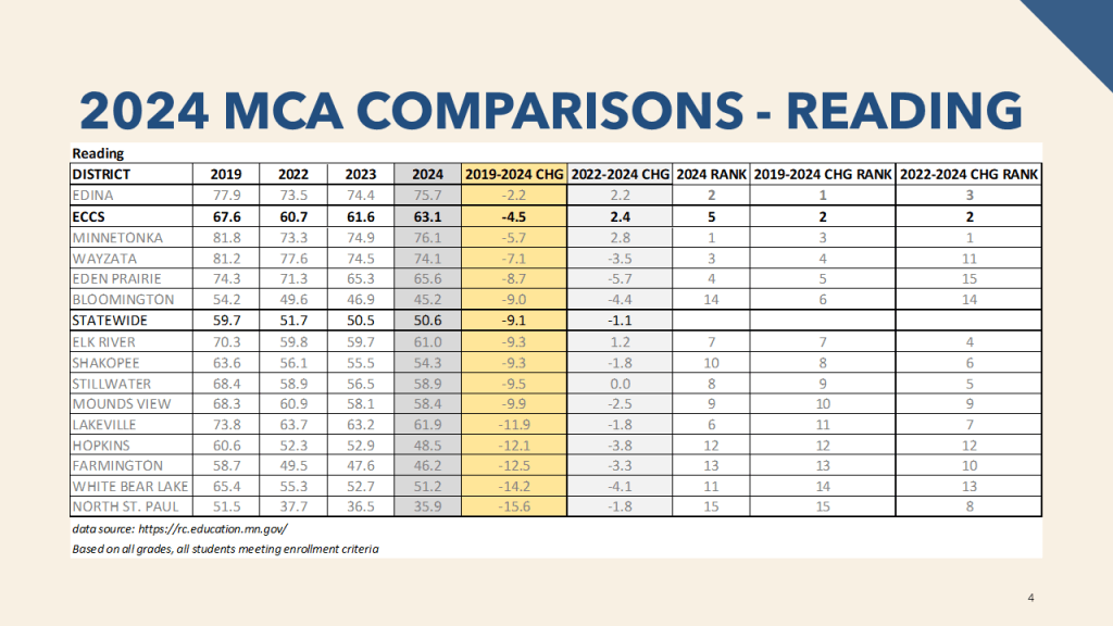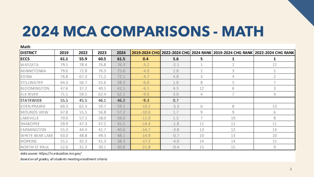 - We are #1 in math and #2 in reading among our peer districts in change in MCA scores both since 2019 and since 2022 — this indicates we saw less of an impact during the pandemic itself *and* we have accelerated our learning back faster than others.